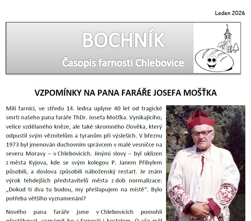 Přečtěte si nové číslo časopisu Bochník. Najdete zde článek se vzpomínkami na P. Josefa Mošťka, připomenutí, že naše diecéze letos oslaví 30 let, rekapitulaci roku 2025 ve farnosti Chlebovice nebo informace o loňském setkání mládeže v Římě, kterého se účastnili i mladí z naší farnosti.